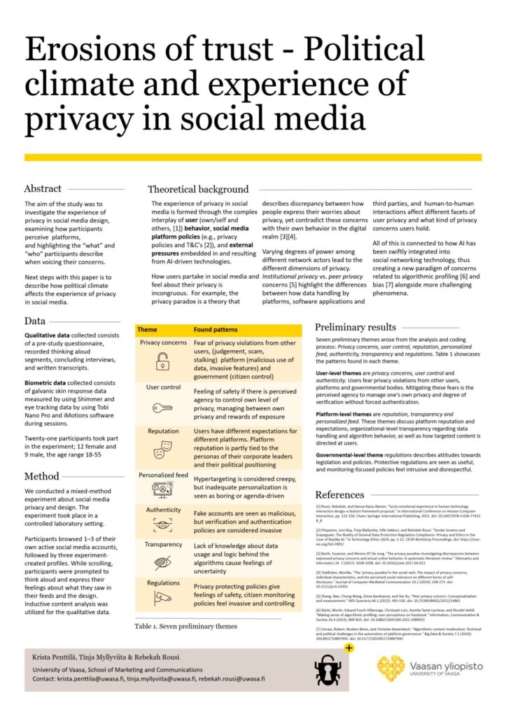 Penttilä, K., Myllyviita, T., Rousi, R. (2025). “Erosions of trust – Political climate and experience of privacy in social media”. Technology Ethics (TETHICS) 2025, Vaasa, Finland.