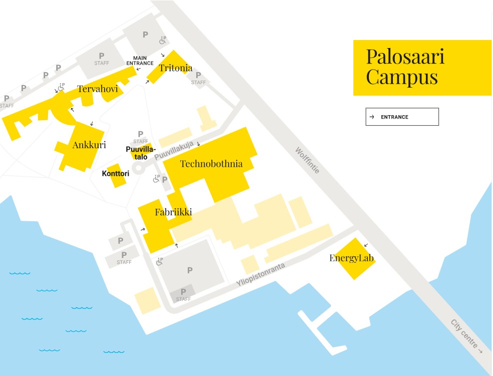 The visiting address of the University of Vaasa is Wolffintie 32, 65200 Vaasa.
