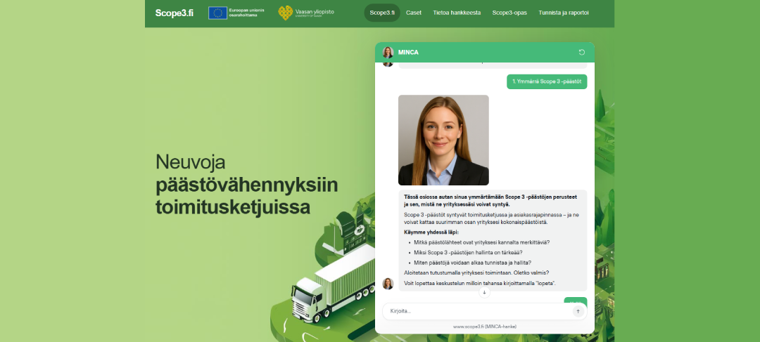 ‘Vaikuta ja kehitä’ -työkalu ja scope3.fi-alusta esillä Wasa Future Festival -tapahtumassaElokuussa olimme mukana Wasa Future Festivalilla, jossa esittelimme hankkeen ajankohtaisia tuloksia ja tarjosimme yrityksille mahdollisuuden tutustua kehitteillä oleviin Scope 3 -työkaluihin. Tapahtumassa esittelimme “Vaikuta ja kehitä” -työkalun, jonka avulla yritykset voivat tarkastella esimerkkejä siitä, miten muut ovat onnistuneet vähentämään toimitusketjujensa päästöjä ja miten näitä ratkaisuja voisi soveltaa omassa toiminnassa. Tilaisuudessa nähtiin myös scope3.fi-alustan ensimmäinen versio, joka toimii kaikkien työkalujen kotina ja tietolähteenä pk-yritysten tarpeisiin. ‘Opi perusteet’ -tekoälytyökalu esillä TietoprovinssissaLokakuussa esittelimme Seinäjoella Tietoprovinssin “Älykkäät teknologiat” -teemapäivässä MINCA-hankkeen ‘Opi perusteet‘ -työkalun. Työkalu auttaa yrityksiä ymmärtämään Scope 3 -päästöjen perusteita ja vaikutuksia oman toiminnan näkökulmasta. Tämä tekoälypohjainen sovellus tarjoaa käyttäjälle sekä ohjattua että vapaata keskustelua aiheesta. Tilaisuudessa työkalumme vastaanotto oli innostunut ja tavoitimme laajan yleisön sekä yritysedustajien että muiden kestävästä teknologiasta kiinnostuneiden parissa. ‘Tunnista ja raportoi arvoketjusi päästöt’ -työkalu esitellään marraskuussa SeinäjoellaTunnista ja raportoi arvoketjusi päästöt -työkalu auttaa yrityksiä hahmottamaan Scope 3 -päästöjään arvoketjun eri vaiheissa. Työkalussa yritys voi kuvata ketjun toimijat, liittää niihin GHG-protokollan mukaisia päästölähteitä sekä määrittää ja raportoida päästöt helposti yhtenäisessä muodossa. Työkalu tukee yritystäsi kestävien hankintojen ja vähäpäästöisemmän liiketoiminnan kehittämisessä. Kutsumme kaikki kiinnostuneet seuraamaan tämän viimeisenä esiteltävän työkalun demotapahtumaa keskiviikkona 26.11.2025 klo 13.00–14.15 Seinäjoella Framissa (Frami B, Kampusranta 9B, 1. krs, Swingi-kokoustila). Päivän ohjelma: Ilmoittaudu tilaisuuteen tästä MINCA-hanke Kestävän kehityksen viikollaSyyskuussa osallistuimme Kestävän kehityksen viikolle (22.–28.9.2025) tuomalla scope3.fi-palvelun kautta esiin toimitusketjujen päästöjen vähentämisen merkitystä erityisesti Etelä-Pohjanmaalla. Osallistumisella pyrimme omalta osaltamme tuomaan näkyväksi maaseudulla tehtävää kestävän kehityksen tärkeää työtä tarjoamalla tietoa ja työkaluja yritysten toimitusketjujen päästöjen hallintaan. MINCA-hankkeessa tehtävä työ tukee YK:n kestävän kehityksen tavoitteita ja on linjassa Vaasan yliopiston kestävän kehityksen strategian kanssa. Lue lisää: https://sites.uwasa.fi/minca/kestava-kehitys/ Pilotointivaihe alkamassaMINCA-hankkeessa seuraava askel on siirtyminen pilotointivaiheeseen. Etsimme nyt pk-yrityksiä erityisesti Etelä-Pohjanmaan alueelta, mutta myös muualta Suomesta, testaamaan ja kehittämään työkaluja yhdessä kanssamme. Pilotoimalla pääset ensimmäisten joukossa kokeilemaan työkaluja, vaikuttamaan niiden jatkokehitykseen ja löytämään uusia tapoja tehdä vastuullisuudesta kilpailuetu. Kokeilu ei maksa sinulle muuta kuin arvokasta aikaasi haluamassasi määrin. Toivomme ainoastaan palautetta työkaluista. Oletko kiinnostunut? Ilmoittaudu mukaan pilotointiin tai ota suoraan yhteyttä oskari.huttunen@uwasa.fi, niin kerromme lisää. Tutustu tarkemmin työkaluihin ja hankkeen etenemiseen: MINCA-hanke LinkedInissä – jaa, tykkää ja pysy mukana hankkeen vaiheissa Terveisin, MINCA-hankeryhmä |