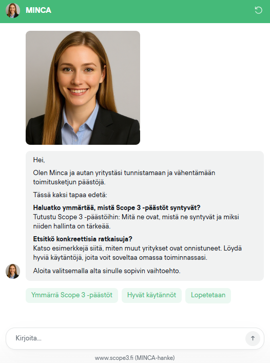 Demo toimii tekoälyavusteisena, keskustelupohjaisena työkaluna, joka hyödyntää tietokantaa eri toimialoista ja tyypillisistä päästölähteistä. Käyttäjä etenee tekoälyn ohjaamana vaiheittain annettujen tietojen pohjalta ja saa ohjauksen oman yrityksen kannalta relevanttien päästölähteiden tunnistamiseen.