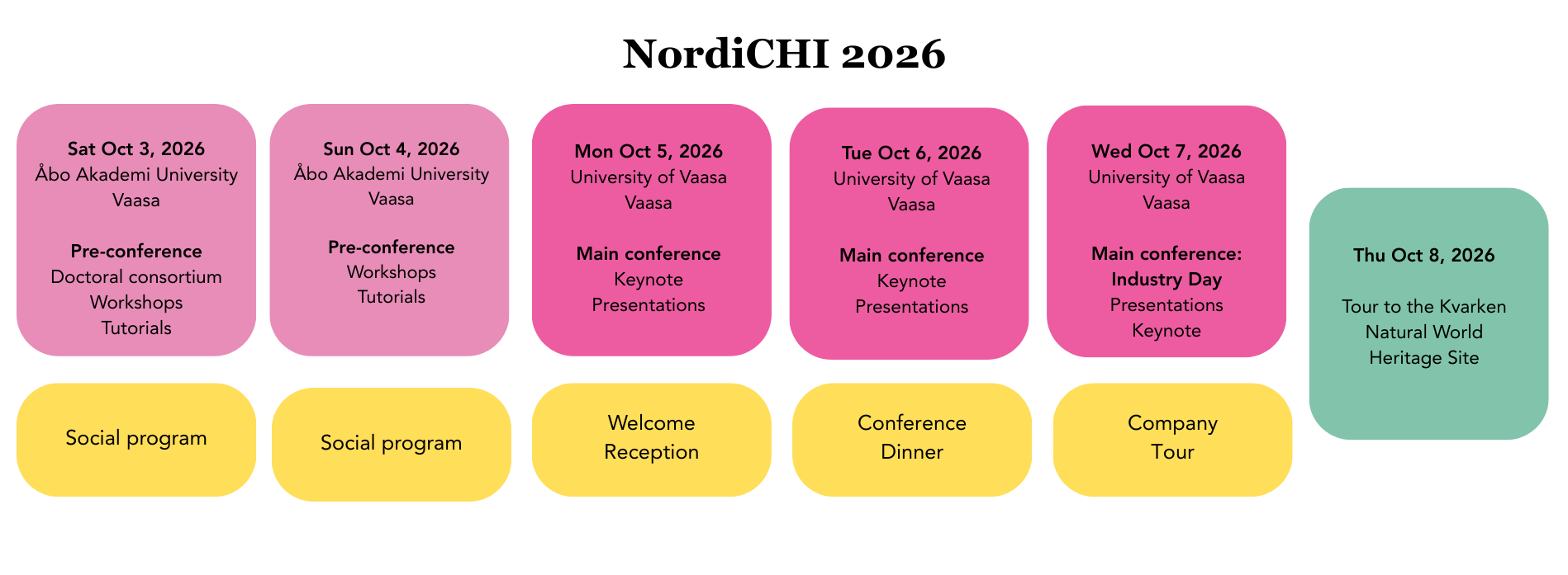 NordiCHI 2026 conference programme overview. The conference runs from Saturday 3 October to Thursday 8 October 2026. Saturday 3 and Sunday 4 October: Pre-conference at Åbo Akademi Vaasa, including doctoral consortium, workshops, and tutorials, with social programme both days. Monday 5 October: Main conference opens at the University of Vaasa with keynote and presentations, followed by a welcome reception in the evening. Tuesday 6 October: Main conference continues at the University of Vaasa with keynote and presentations, followed by a conference dinner. Wednesday 7 October: Main conference Industry Day at the University of Vaasa with presentations and keynote, followed by a company tour. Thursday 8 October: Tour to the Kvarken Natural World Heritage Site.