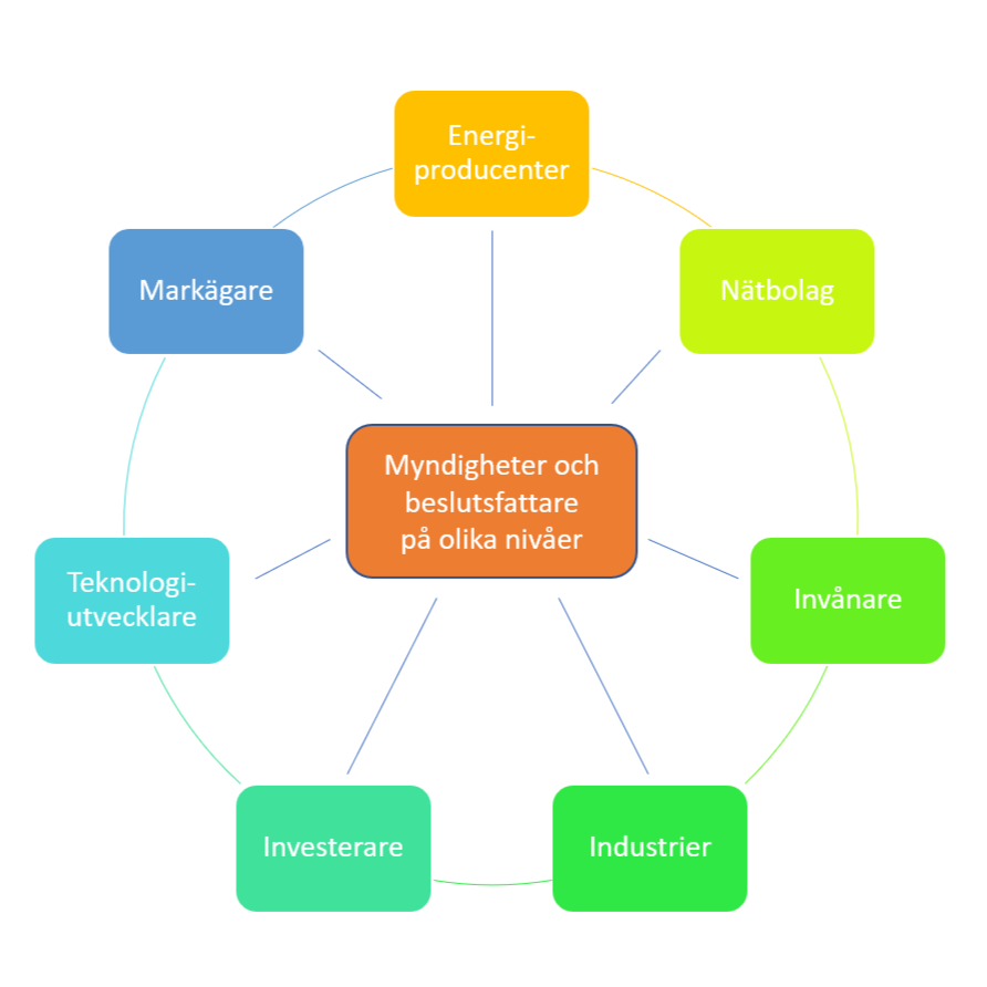 För att bättre förstå aktörerna och därmed ”spelet” är det bra att lista nyckelaktörerna och deras respektive roller i lokal energiproduktion och -konsumtion. I förenklad form kan de presenteras på följande sätt: